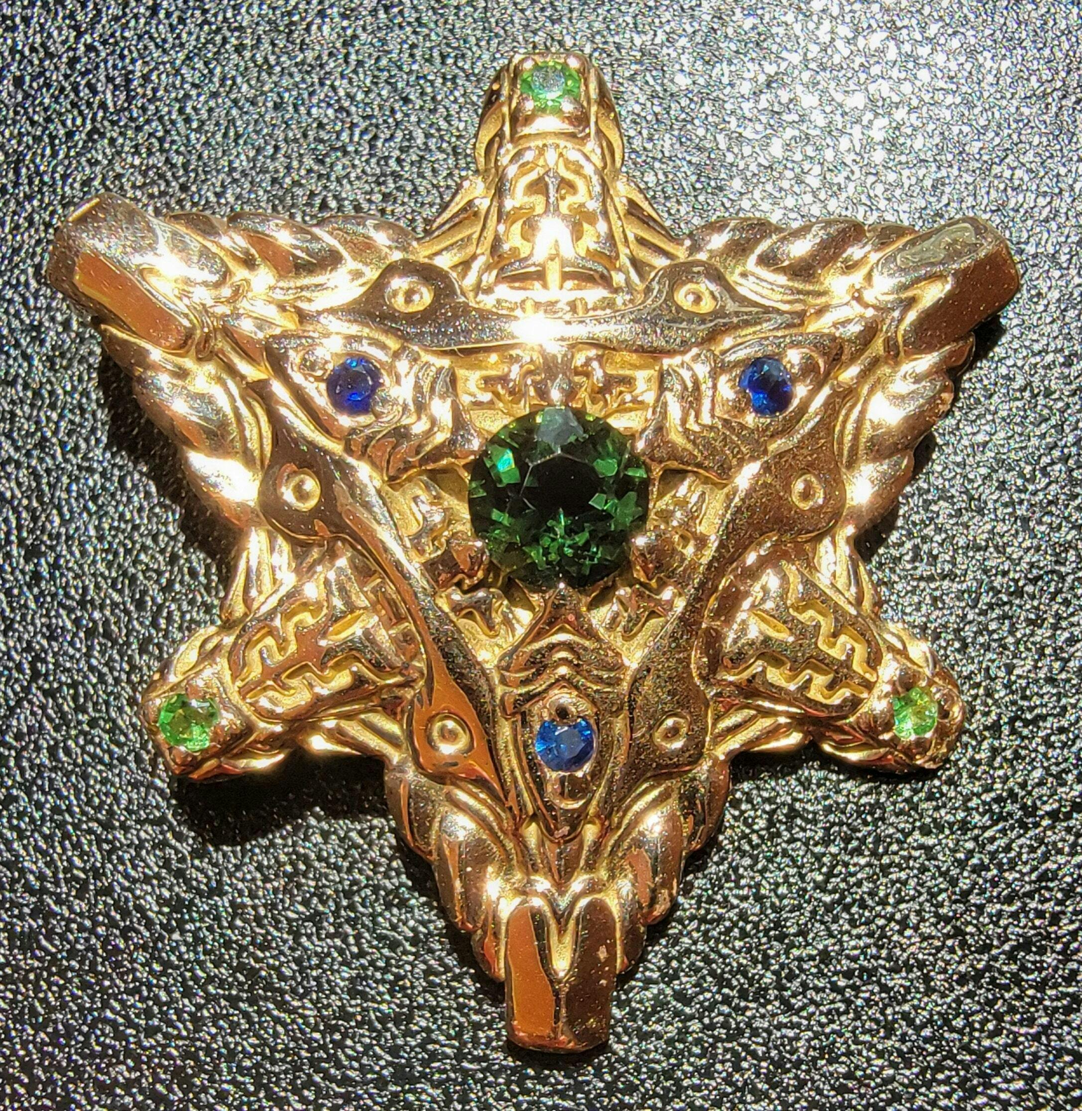 14K solid gold Stargate Merkaba Pendant with precious gemstones: tourmaline, sappire and emerald gemstones (on photo).